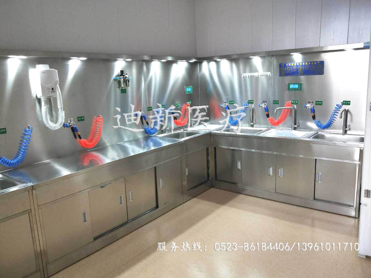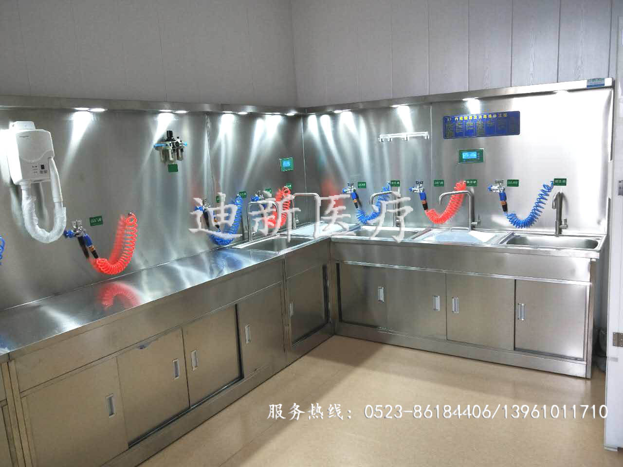 熱烈祝賀山西晉中不銹鋼清洗裝置安裝調(diào)試完畢! 迪新不銹鋼清洗裝置主要采用優(yōu)質(zhì)304不銹鋼材質(zhì)制成,具有耐腐蝕且不容易滋生細菌的特點。 本產(chǎn)品主要由初洗槽、酶洗槽、次洗槽、浸泡槽、末洗槽、干燥臺組成,多槽及干燥臺分程序獨立控制清洗,互不干擾!控制系統(tǒng)主要采用微電腦控制,配備高壓水槍、高壓氣槍、氣體處理器、消毒液處理系統(tǒng)、干燥功能、節(jié)液(酶)系統(tǒng)、測漏系統(tǒng)、水處理系統(tǒng)、給排水系統(tǒng)、照明系統(tǒng)、可選智能控制系統(tǒng)及其他輔助設(shè)備。 本清洗設(shè)備可根據(jù)不同醫(yī)院房間的具體尺寸和布局結(jié)構(gòu)量身訂做,醫(yī)院可根據(jù)自身內(nèi)鏡數(shù)量的多少及診流量來選擇相應的配置。本公司24小時服務熱線:0523-86184406/13961011710    |